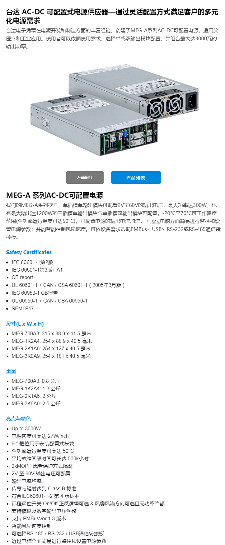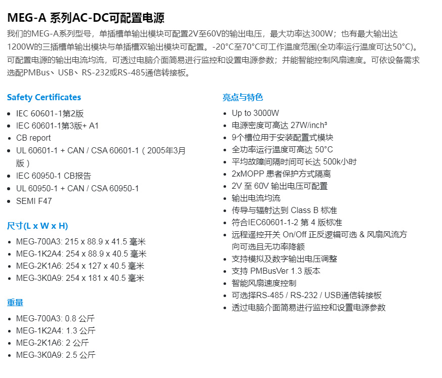 臺達提供用于醫療和工業應用的MEG-A系列AC-DC可配置電源。電源模塊各自獨立,使用者可以依照使用需求,配置單或雙輸出模塊至最大2100瓦的輸出組合。適用于于醫療或工業應用。